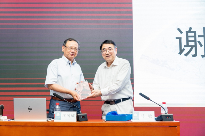 图为5月21日马敏教授向沈国威教授赠予章开沅学术讲座纪念牌。刘瑶摄。