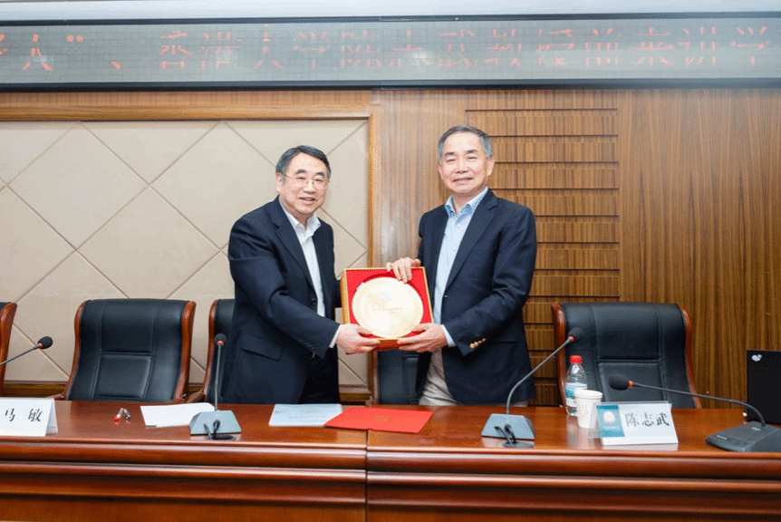 图为5月14日马敏教授向陈志武教授赠予章开沅学术讲座纪念品。赵书勤摄。