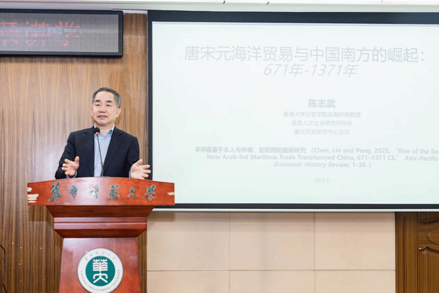 2025年5月14日下午3时,香港大学经管学院金融学讲座教授、香港人文社会研究所所长和量化历史研究中心主任陈志武应邀作为2025年度“章开沅学术讲座学人”,在华中师范大学逸夫国际会议中心一楼报告厅为广大师生作了一场大型学术讲座,题为“唐宋元海洋贸易与中国南方的崛起:671年至1371年”,讲座由华中师范大学资深教授、中国近代史研究所马敏所长主持。
